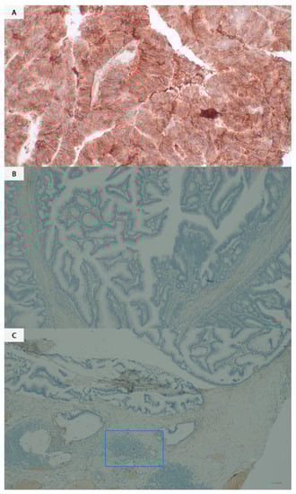 B7H3 immunostaining in CRC specimens. (A) B7H3 positive staining (B,C) B7H3 negative staining. (C) Tumour infiltrating lymphocytes are marked in frame (Opta Tech 2200 Camera (Opta Tech, Warsaw, Poland), magnification 200×).