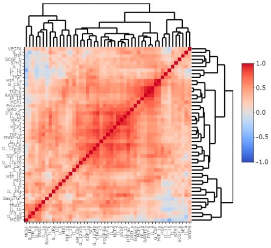 The levels of chemokines/cytokines/growth factors were assessed in 77 tissue homogenates using the Bio-Plex Pro Human cytokines screening panel 48 cytokines assay (Bio-Rad Laboratories, Hercules, CA, USA) following the manufacturer’s procedure. Briefly, 50 µL aliquot of tissue homogenate was diluted 1:2 with sample diluent, incubated with anti-body-coupled beads, biotinylated secondary antibodies, and subsequently with streptavidinphycoerythrin. Standard curves for each examined molecule were performed using corresponding cytokine standard solutions. The beads were measured using the Bio-Plex 200 System. The intra-assay %CV varied up to 15%, and the inter-assay %CV varied up to 25%, depending on the studied protein. We transformed the obtained levels to the corresponding total protein concentrations. This method was applied in our previous research [,].