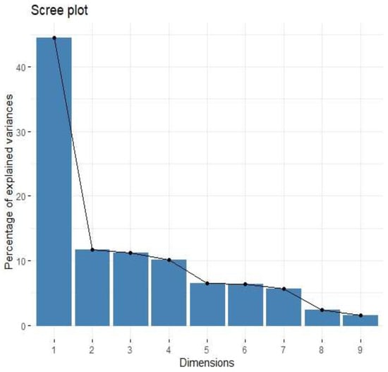 Scree plot of percentage of explained variances for nine principal components from the PCA for cytokines associated with M2 macrophages.
