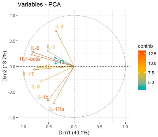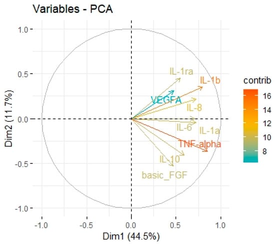 Principal Components 1 and 2 representing variance in two dimensions from the PCA for cytokines associated with M2 macrophages.
