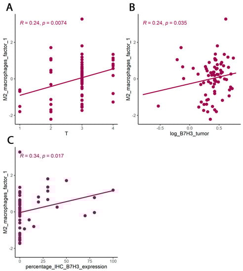 PCA for cytokines associated with M2 macrophages. (A) Correlation between M2 macrophage factor 1 (principal component 1) and T parameter (Kendall rank correlation coefficient). (B) Correlations between M2 macrophage factor 1 (principal component 1) and concentration of B7H3 in tumour tissue homogenates. (C) correlation between M2 macrophage factor 1 (principal component 1) and percentage IHC B7H3 expression in tumours (Spearman correlation coefficient).