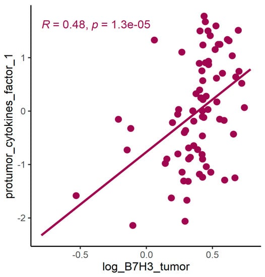 In PCA for protumour cytokines (Figure 8 and Figure 9, Table 5 and Table 6), factor 1 was positively associated with concentrations of B7H3 in tumour tissue homogenates (Figure 10).