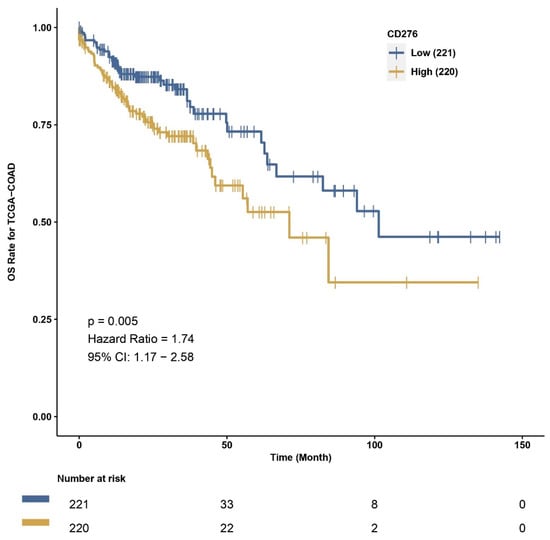 CAMOIP allows us to perform survival analysis according to the low or high expression level of each gene in the TCGA cohort. To investigate the difference in overall survival between individuals with high and low B7H3 expression in the TCGA COAD cohort, we performed a survival analysis in CAMOIP. The patients with high B7H3 expression showed significantly decreased overall survival time compared to the low expression group (Figure 11).