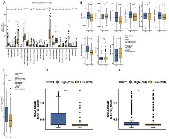 Immunological landscape in CRC tumours according to high and low B7H3 expression. analyses received from CAMOIP based on TCGA-COAD dataset. (A) Comparison of immune cells infiltration scores estimated by CIBERSORT algorithm between B7H3 high- and B7H3 low-expression tumours. (B) Immune-related scores in CRC tumours with upregulated and downregulated B7H3 expression * p < 0.05, ** p < 0.01, and *** p < 0.001. **** p < 0.0001, ns = not significant (C) Expression of CD163 (M2 macrophage marker) in B7H3 low and high expression groups. (D,E) Differences in MANTIS score between groups with high and low expression of B7H3 and CD274 (PD-L1). MANTIS score predicts tumour MSI status by assuming values from 0 (entirely MSS) to 2.0 (entirely MSI). The greater the MANTIS score, the more likely tumour MSI status.