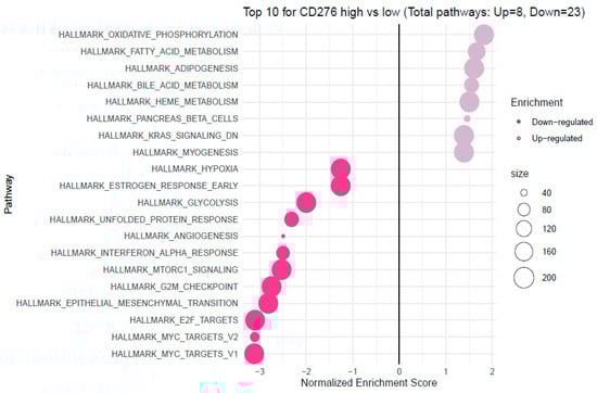 To determine pathways activated in tumours with upregulated B7H3 expression, gene set enrichment analysis (GSEA) was performed to analyze the difference in gene expression between low and high B7H3 expression datasets. Significantly upregulated and downregulated pathways (p. adjusted < 0.05) in the enrichment of the Molecular Signature Database Collection for Hallmark gene sets are provided in Figure 13 and Figure 14. The results indicated that the most upregulated pathways for high B7H3 expression included oxidative phosphorylation, fatty acid metabolism, adipogenesis, bile acid metabolism, heme metabolism, pancreas beta cells, and genes downregulated by KRAS activation. These findings could suggest that tumours with high B7H3 expression may exhibit impaired intracellular processes and change in KRAS signalling. On the contrary, elevated expression of B7H3 was related to downregulation in pathways associated with hypoxia, glycolysis, interferon alpha response, MTORC1 signalling, G2M checkpoint and E2F targets suggesting a potential link between B7H3 and altered cell cycle regulation (Figure 13).