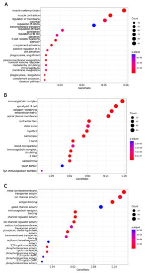 Significantly enriched GO annotations of B7H3 in FieldEffectCrc dataset. (A) biological processes; (B) cellular components; (C) molecular functions.