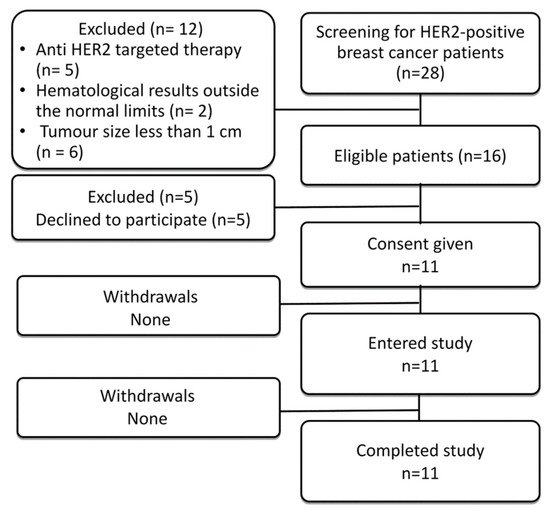 According to the clinical trial registration, “Inclusion criteria were: over 18 years of age; diagnosis of primary breast cancer with possible lymph node metastases; availability of results from HER2 status test previously determined using biopsy material from a primary tumour: HER2-positive, defined as a DAKO HercepTest™ score of 3+ or FISH positive; haematological, liver and renal function test results within the following limits: white blood cell count: >2.0 × 109/L, haemoglobin: >80 g/L, platelets: >50.0 × 109/L, ALT, ALP, AST: ≤5.0 times Upper Limit of Normal; bilirubin ≤ 2.0 times Upper Limit of Normal; serum creatinine: Within Normal Limits. A negative pregnancy test was requested from all patients of childbearing potential. Sexually active women of childbearing potential participating in the study had to use a medically acceptable form of contraception for at least 30 days after study termination. Subjects had to be capable to undergo the diagnostic investigations planned in the study.