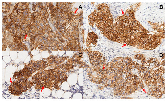 Representative images of immunohistochemistry staining of formalin-fixed and paraffin-embedded biopsy samples from primary tumours (A,B) and lymph node metastases (C,D). Samples from patients 5 (A,C) and 8 (B,D). Sections were stained using HercepTest. Multiplication factor ×20. Samples show uniform membrane staining of neoplastic cells. Arrows point at typical cells.