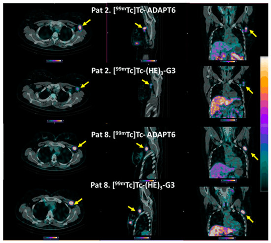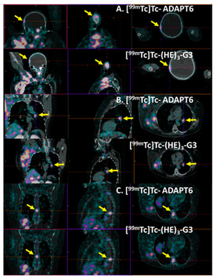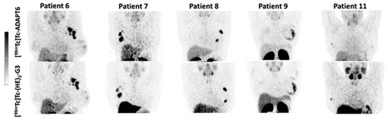 All known lymph node metastases were visualized using both [99mTc]Tc-ADAPT6 (2 h after injection) and [99mTc]Tc-(HE)3-G3 (4 h after injection) (see representative images in Figure 7).