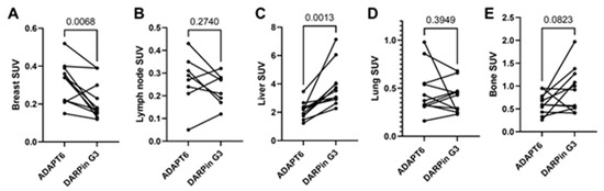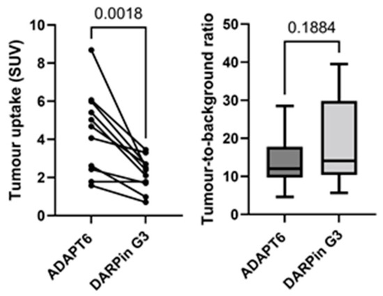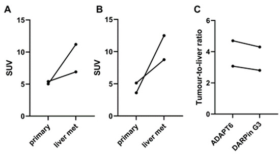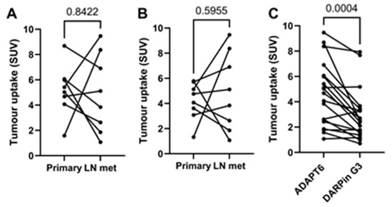 There was a noticeable difference between uptake values in some primary tumours and the corresponding lymph nodes (Figure 8A,B), but no correlation between the size of paired lesions and uptake value was found, which permitted the exclusion of the partial volume effect. Overall, the uptake of [99mTc]Tc-ADAPT6 in all extrahepatic lesions was significantly (p < 0.0004) higher than the uptake of [99mTc]Tc-(HE)3-G3 (Figure 8C).