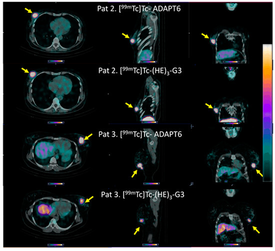 Both [99mTc]Tc-ADAPT6 and [99mTc]Tc-(HE)3-G3 were capable of visualizing HER2-expressing breast cancer lesions, including primary tumours, lymph node metastases and, in two patients, hepatic metastases. A significantly higher uptake of [99mTc]Tc-ADAPT6 in soft tissue lesions and its significantly lower uptake in the normal liver might be the advantages of this tracer in clinics.