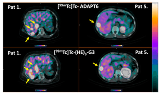 Each patient was injected with [99mTc]Tc-ADAPT6, followed by injection with [99mTc]Tc-(HE)3-G3 after 3–4 days. In patient 1, the interval between injection was 15 days.