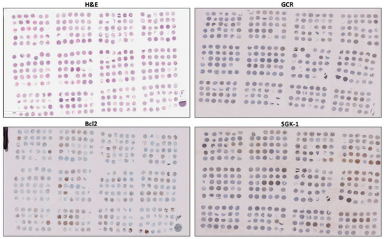 Representative images of one of the tissue microarrays (TMAs) stained for hematoxylin and eosin (H&E) and the targeted proteins in the study: GCR, SGK1, and Bcl-2.