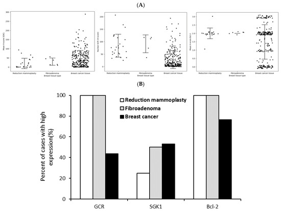 Lower GCR, higher SGK1, and Bcl-2 staining in cancer tissue compared to non-cancer breast tissue. The mean H scores (A) and percentages (B) of cases with high expression of SGK1 and Bcl-2 in breast cancer vs. noncancerous tissue (Reduction mammoplasty and fibroadenoma).