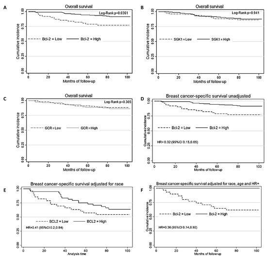 We also evaluated the correlation of GCR, SGK1, and Bcl-2 with overall survival and breast cancer-specific survival. Data from 263 cases for Bcl-2, 266 cases for GCR, and 271 cases for SGK1 were available for this analysis. The median follow-up time was 79 months (a range of 6 to 103 months). During the follow-up period, 52 cases of death from any cause and 43 deaths from breast cancer were recorded. Cases with high Bcl-2 have a higher overall survival rate compared to cases with low Bcl-2 (log-rank p = 0.0478) (Figure 6A) and breast cancer-specific survival (log-rank p = 0.0025) (Figure 6D). In the Kaplan–Meier analysis, patients with low Bcl-2 expression had a significantly lower survival probability than those with high Bcl-2 expression (HR 0.53, 95% CI 0.29, 0.97). Increased expression of Bcl-2 was associated with a protective effect on breast cancer-specific survival (HR 0.32, 95% CI 0.16, 0.65). High expression of Bcl-2 remained strongly associated with breast cancer survival after an adjustment for race (HR 0.41, 95% CI 0.2, 0.85). The expression of BCL-2 remained strongly positively associated with protection against breast cancer death, with an additional adjustment for age and ER+ or PR+ status (HR = 0.36, 95% CI 0.14, 0.92). SGK1 and GCR staining was not related to overall or breast cancer-specific survival.