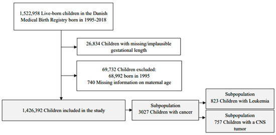 In the case of fatality analyses, the children with the cancer in question (i.e., of any cancer, leukemia or a CNS tumor) were followed from the date of cancer diagnosis to date of death, date of emigration or end of follow-up 31 December 2018, whichever came first. The Cox proportional hazards models included the exposure variable of interest and the a priori selected potential confounders maternal age and calendar year at birth (in the above-mentioned categories) as well as the age at diagnosis (<1 year old, 1–5 years old, 6–10 years old and >10 years old) included as strata.