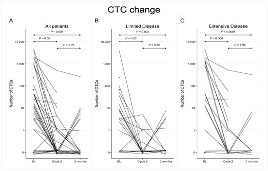 Longitudinal analysis of circulating tumor cells from baseline to chemotherapy Cycle 3 and at a 2-month follow-up. All patients are represented in panel (A) (N = 42), while panels (B,C) display patients with limited disease (N = 21) and extensive disease (N = 21), respectively. Note: The y-axis scale is logarithmic, base 10. CTC counts of zero are plotted at y = 0.1 on this scale, a point which therefore has been labelled 0. * Patients where baseline samples only were available for analysis (N = 3).