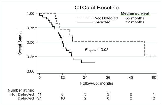 The presence of CTCs at baseline correlated significantly to reduced survival, with median overall survival of 12 and 55 months in patients with and without detectable CTCs, respectively, corresponding to 2-year survival rates of 15% and 52% (Figure 2), and a univariable HR of 2.75 (95% confidence interval (CI) 1.05–7.20; p = 0.040; Table 2). Adjustment for stage, age (linear), gender and performance status (0–1 vs. 2–3) resulted in a HR of 2.11 (95% CI 0.78–5.70; p = 0.140).