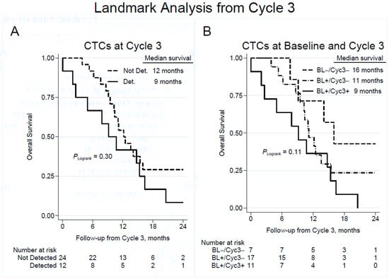 The estimated survival at 6 months from start of Cycle 3 was 92% in patients with undetectable CTCs and 67% in patients with detectable CTCs at Cycle 3 (Figure 3A). At 12 months from CTC sampling at Cycle 3, the survival was 54% and 42% in patients without and with CTCs, respectively, implying that the prognostic value of CTC detection during treatment declined over time.