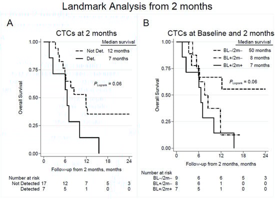 A corresponding landmark analysis based on CTC count at a 2-month follow-up yielded a median OS of 12 and 7 months in patients with undetectable and detectable CTCs, respectively, with an unadjusted HR of 2.43 (95% CI 0.93–6.38; p = 0.071; Figure 4A and Table 2). Compared to patients with persistently negative CTC counts, survival from a 2-month follow-up was significantly reduced in patients with continuously detectable CTCs (unadjusted HR 4.22; 95% CI 1.20–14.91; p = 0.025; Figure 4B and Table 2). Multivariable Cox regression models did not reveal any associations between CTC positivity and survival at the different time points (Supplementary Table S2).