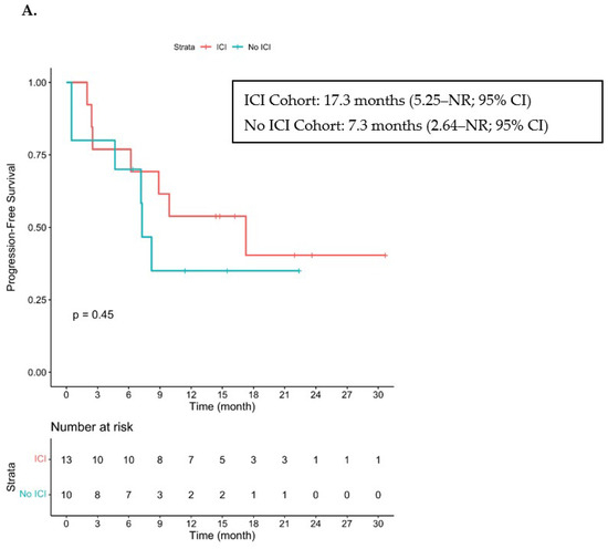 Kaplan–Meier Curve of PFS and OS. ICI—immune checkpoint inhibitor. (A) Progression-free survival in patients who received ICI prior to cetuximab (cohorts A + B) and in those who did not receive ICI prior to cetuximab (cohort C). (B) Overall survival in patients who received ICI prior to cetuximab (cohorts A + B) and in those who did not receive ICI prior to cetuximab. NR stands for Not Reached.