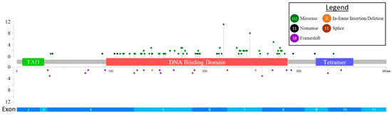 Distribution and frequency of TP53 mutations in the cohort. Lolliplot indicates the distribution and frequency of TP53 missense, nonsense, frameshift, in-frame deletions/insertions, and splice site mutations.