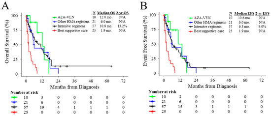 Outcomes according to frontline treatment modality. Kaplan–Meier plot for (A) OS and (B) EFS of patients with TP53MUT AML stratified by frontline treatment regimen.