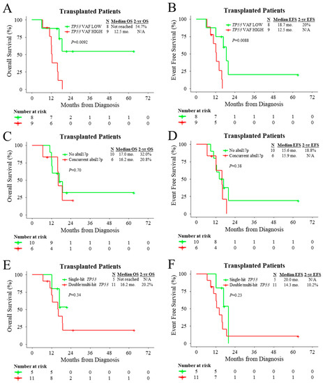 - Loke, J.; Labopin, M.; Craddock, C.; Cornelissen, J.J.; Labussière-Wallet, H.; Wagner-Drouet, E.M.; Van Gorkom, G.; Schaap, N.P.M.; Kröger, N.M.; Veelken, J.H.; et al. Additional cytogenetic features determine outcome in patients allografted for TP53 mutant acute myeloid leukemia. Cancer 2022, 128, 2922–2931. [Google Scholar] [CrossRef] [PubMed]