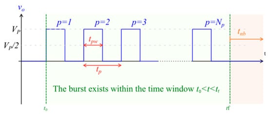 Illustration of monophasic pulse burst, which is representative of that used in traditional, low-frequency electroporation. Vp = setpoint pulse amplitude; Np = total number of pulses in the burst; tpw = pulse width (the time between the half amplitude crossings); tp = pulse period; tnb = time interval from the end of one burst to the start of the next burst; to = time instant at the start of the burst; tf = time instant at the end of the burst.
