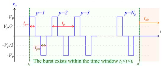 Image of biphasic pulse waveform, representative of the pulses used in high-frequency electroporation. Vp = setpoint pulse amplitude; Np = total number of pulses in the burst; tpw = pulse width (the time between the half amplitude crossings); tp = pulse period; tnb = time interval from the end of one burst to the start of the next burst; to = time instant at the start of the burst; tf = time instant at the end of the burst.