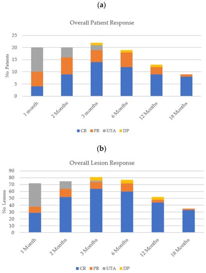 A complete response was observed in 14 patients at three months follow-up, with a partial response seen in 5 patients, and 1 patient developed disease progression (Figure 4a). Three patients had been withdrawn/LTFU at this time point, and two patients had lesions that were unable to be assessed. Of the 22 patients that remained on study, there was an overall response (OR) rate of 86% (n = 22 patients), where overall response included partial and complete responses.