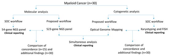 The present study aimed at evaluating a combinatorial approach of utilizing OGM and the 523-gene NGS panel as an alternate diagnostic workflow compared to the current SOC cytogenetic and molecular technologies for genomic characterization of myeloid cancers. A similar approach was recently used by Nilius-Eliliwi et al., 2022, in the characterization of a case of AML using OGM and whole exome sequencing, identifying novel gene fusion and rare variants, proposing a next-generation diagnostic workflow. The present study demonstrated the following: (a) higher resolution of OGM in detecting SVs and CNVs as compared to the combination of current SOC cytogenetic techniques (karyotyping and FISH), (b) greater clinical utility of the 523-gene NGS panel as compared to a 54-gene NGS panel for detecting clinically relevant sequencing variants, and (c) greater simplicity and clinical utility of combining OGM with a 523-gene NGS panel for a comprehensive approach to a higher success rate in the profiling of myeloid cancers.