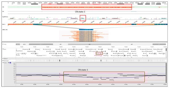 The current iteration of NxClinical does not support the SV calls from OGM data; hence Bionano access (v.1.6) was utilized for OGM data, QCI-I for sequencing data, and NxClinical for combined CNV and sequencing data viewing and analysis of compound heterozygous events overlapping CNV segments. In addition to simultaneous visualization of CNV and sequencing variants, BAM files from the NGS panel were utilized to call CNVs in NxClinical using the baseline sequencing reads throughout the genome. This approach was used to confirm the novel CNV calls detected by OGM with an alternative method (NGS) and detect compound heterozygous events.