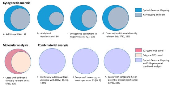 5.3. OGM and 523-Gene NGS Panel Compared to the Current Diagnostic Workflow (Karyotype, FISH, and 54-Gene NGS Panel)