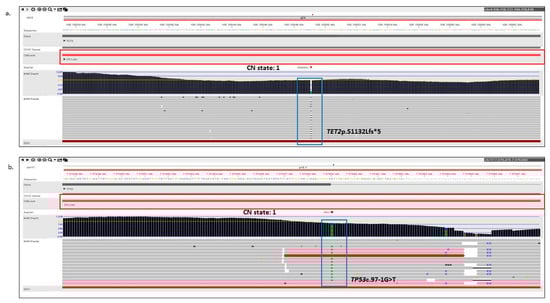 Representative examples of compound heterozygous events in two samples detected with combined visualization of copy number variants and single nucleotide variants in software. (a) The copy number loss is highlighted in red, with a CN state of 1, while the pathogenic TET2p.S1132Lfs*5 variant is highlighted in blue. (b) The copy number loss is highlighted in red, with a CN state of 1, while the pathogenic TP53c.97-1G>T splice variant is highlighted in blue.