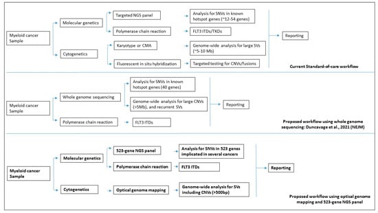 Comparison of the proposed workflow of optical genome mapping and 523-gene NGS panel with current diagnostic workflow and workflow proposed by Duncavage et al., 2021 [19] using whole genome sequencing.