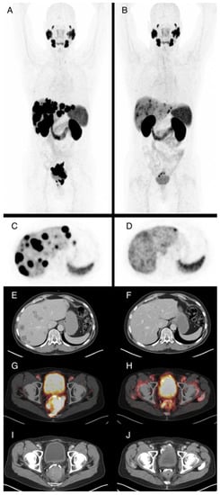 61-year-old patient with locally advanced prostate cancer and metastases in lymph nodes, bone, and liver. Maximum intensity projections of Ga-68-PSMA-PET/CT before (A) and after ((B), SUVmax. 15) four cycles of Lu-177-PSMA radioligand therapy (RLT) with application of 23.6 GBq in total, which demonstrate very good partial response. PSA levels were 25.5 ng/mL prior to RLT and 0.04 ng/mL after the fourth cycle. Axial PET images of the liver before (C) and after (D) therapy show reduction of PSMA-expression of the liver metastases, associated with subtotal reduction of hypodense liver metastases in contrast enhanced CT (E,F). The locally advanced primary cancer also shows substantially reduced PSMA expression of the tumor, with infiltration of the rectum in fusion images (G,H) and contrast enhanced CT images (I,J) from baseline to staging after four cycles of RLT.