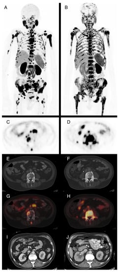 74-year-old patient with locally recurrent prostate cancer and metastases in lymph nodes and bone. Maximum intensity projections of F-18-PSMA-PET/CT before (A) and after ((B), SUVmax. 15) two cycles of Lu-177-PSMA radioligand therapy (RLT) with application of 10.7 GBq total demonstrate progressive disease. PSA levels were 169 ng/mL prior to RLT and 233 ng/mL after two cycles. Axial PET images show increasing PSMA-expression in the L4 vertebra (C,D) that is not totally reflected in corresponding CT images with sclerotic bone lesions (E,F). (G,H) show image fusion of PET and CT at the same position as (E,F). Due to progressive metastatic obstruction of the right ureter, postrenal kidney failure with hydronephroses occurred and a ureteral stent was placed (J, compared to I). This also explains the reduced tracer excretion via the right kidney observed in (B).