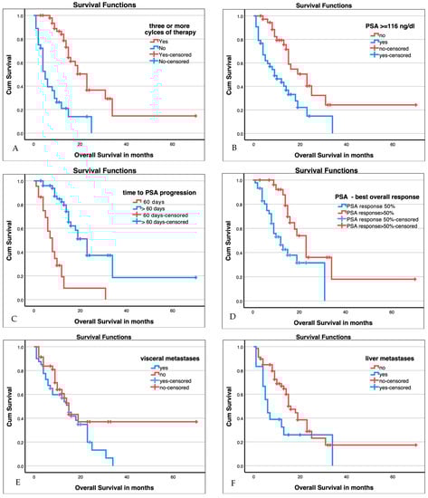 Median OS was 15 months (95% CI 12.8–17.2 months). Median OS was stratified by clinical, haematological, and response criteria (VISION criteria fulfilled, three or more therapy cycles completed, presence of visceral metastases, presence of liver metastasis, haemoglobin levels ≥ 10 g/dL, AP, LDH, PSA best overall response, time to PSA progression, and PSMA-PET/CT response). Table 3 summarizes the median survival and significance of group differences stratified by these factors. Of those with three or more therapy cycles completed, haemoglobin levels ≥ 10 g/dL, AP, LDH, PSA best overall response, time to PSA progression, and PSMA-PET/CT response showed significant group differences. Exemplary Kaplan–Maier plots are shown in Figure 3 below.