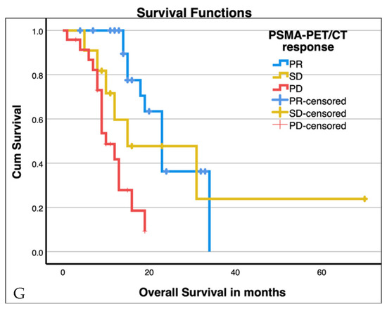 Kaplan–Maier plots for patients with three or more cycles of therapy ((A), p < 0.001), baseline PSA ≥ 116 ng/mL (median, (B), p > 0.001), time to PSA progression ((C), p < 0.001), best overall PSA response ((D), p < 0.005), presence of visceral metastases ((E), n.s.), presence of liver metastases ((F), p = 0.029), and PSMA-PET/CT response ((G), p < 0.001; SD stable disease, PD progressive disease, PR partial response). Additional values are given in Table 3.