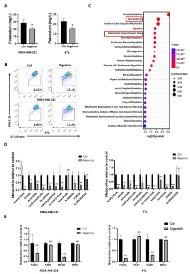 We then sought to elucidate the mechanism of how nigericin induced pyroptosis in TNBC cells. Nigericin works as an ionophore, which causes efflux of potassium from the cell [17,18]. Using inductively coupled plasma mass spectrometry (ICP-MS), nigericin was shown to reduce intracellular potassium in both MDA-MB-231 and 4T1 cells (Figure 3A). Specific to mitochondria, nigericin-induced K+ efflux was accompanied by H+ uptake, which uncoupled oxidative phosphorylation and inhibited the mitochondria respiration by decreasing the membrane potential [30,31]. JC-1 probes are widely used to detect the mitochondrial membrane potential change [32]. After nigericin treatment, the proportion of JC-1-labeled TNBC cells in green fluorescence increased, suggesting that the mitochondrial membrane potential decreased (Figure 3B). We then screened the metabolites associated with mitochondrial metabolism via mass spectrometry, finding that the metabolites in tricarboxylic acid (TCA) cycle were the most significantly affected of all metabolic pathways in nigericin-treated TNBC cells (Figure 3C). All metabolites in the TCA cycle decreased (Figure 3D). Consistent with the above results, FADH2 and NADH also decreased upon nigericin treatment (Figure 3E), supporting the idea that oxidative phosphorylation was impaired after nigericin treatment. These results indicated that nigericin treatment induced the mitochondrial dysfunction.