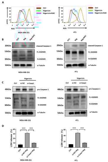 Previous studies showed that Caspase-1 activation was responsible for the GSDMD-dependent pyroptosis [11,12]. Mitochondria dysfunction, which was accompanied by increased levels of mitochondrial reactive oxygen species (mROS), which was caused by Caspase-1 activation [33,34]. Herein, we showed that nigericin induced pyroptosis via the Caspase-1/GSDMD pathway (Figure 1 and Figure 2) and mitochondria dysfunction in TNBC cells (Figure 3). We hypothesized that nigericin activated Caspase-1 by inducing mitochondria dysfunction and ROS accumulation in TNBC cells. Indeed, nigericin treatment increased the ROS level in TNBC cells (Figure 4A). Previous studies showed the mROS accumulation resulted in mitochondria membrane damage and increased permeabilization, allowing the release of mitochondrial DNA (mtDNA) from mitochondria, thus leading to decreased mtDNA being present in mitochondria [35,36]. We also found that the mtDNA decreased after nigericin treatment in TNBC cells (Figure S3A). In addition, treatment with N-acetylcysteine (NAC), which is an antioxidant commonly used for scavenging ROS and protecting mitochondria [37], prevented nigericin-induced ROS production (Figure 4A) and pyroptosis (Figure S3B). The nigericin-increased level of cleaved Caspase-1 was dampened in NAC pre-treated cell lines (Figure 4B). The increased level of N-terminal fragments of GSDMD upon nigericin treatment was also reversed (Figure 4B). Furthermore, neither cleavage of GSDMD (Figure 4C) nor elevated LDH release (Figure 4D) was observed in Caspase-1 knockdown TNBC cells upon nigericin treatment, which verified that nigericin induced pyroptosis in a Caspase-1-dependent manner. Together, these data suggested that the nigericin-induced pyroptosis in TNBC cells was elicited via mitochondria dysfunction and the following Caspase-1 activation.
