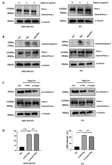 We showed that nigericin induced both pyroptosis and apoptosis in TNBC cells (Figure 1). Evidence showed that ROS accumulation mediated the alteration of mitochondria membrane permeabilization and caused the release of mitochondrial contents, such as cytochrome C, thus triggering the mitochondrial apoptosis [38,39,40]. Activated Caspase-3 cleaves Parp-1 to prevent DNA repair and promote apoptosis [41]. We observed increased levels of cleaved Parp-1 in nigericin-treated TNBC cells (Figure 5A). Next, we sought to test whether nigericin-mediated apoptosis was rescued by reducing the ROS accumulation in mitochondria. We showed that NAC could reverse nigericin-mediated ROS accumulation and protect mitochondria. Consistently, pre-treatment with NAC reversed the increased level of cleaved Parp-1 (Figure 5B), thus rescuing the nigericin-induced TNBC cells apoptosis (Figure S3B). The cytosol cytochrome C activates apoptosome to mediate Caspase-3 cleavage and trigger apoptosis [38,39,40]. Although activated Caspase-3 can cleave GSDME to induce pyroptosis and cleave Parp-1 for apoptosis, our above data suggested that Caspase-3/GSDME was not involved in nigericin-mediated pyroptosis (Figure 1). Thus, we speculated that the upregulated cleaved Caspase-3 participated in nigericin-mediated apoptosis. Consistently, the upregulated Caspase-3 cleaved via nigericin treatment could be restored via NAC pre-treatment (Figure 5B). In addition, the cleaved Parp-1 upon nigericin treatment decreased upon Caspase-3 knocking down (Figure 5C), suggesting the crucial role of Caspase-3 in nigericin-induced apoptosis. On the other hand, the release of LDH in nigericin-treated TNBC cells was not impacted upon Caspase-3 knocking down (Figure 5D), which further verified that Caspase-3 was not involved in nigericin-induced pyroptosis. Taken together, these data suggested that nigericin-mediated mitochondria dysfunction induced apoptotic cell death via Caspase-3 activation.