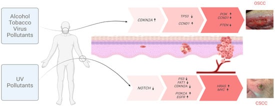 Inducing factors and multistep progression of OSCC and CSCC. Mutagenic agents responsible for the initiation and progression of OSCC (top) and CSCC (bottom) tumors. The main genes bearing characteristic cumulative mutations at each step of the process are indicated. Arrows next to each gene indicate the changes in the expression (↑ up; ↓ down).