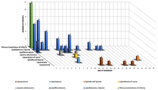 - Fetsch, J.F.; Miettinen, M.; Laskin, W.B.; Michal, M.; Enzinger, F.M. A clinicopathologic study of 45 pediatric soft tissue tumors with an admixture of adipose tissue and fibroblastic elements, and a proposal for classification as lipofibromatosis. Am. J. Surg. Pathol. 2000, 24, 1491–1500. [Google Scholar] [CrossRef]