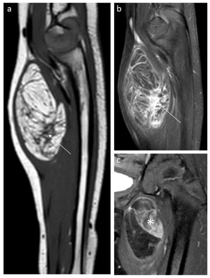 - Gupta, P.; Potti, T.A.; Wuertzer, S.D.; Lenchik, L.; Pacholke, D.A. Spectrum of Fat-containing Soft-Tissue Masses at MR Imaging: The Common, the Uncommon, the Characteristic, and the Sometimes Confusing. Radiographics 2016, 36, 753–766. [Google Scholar] [CrossRef]
