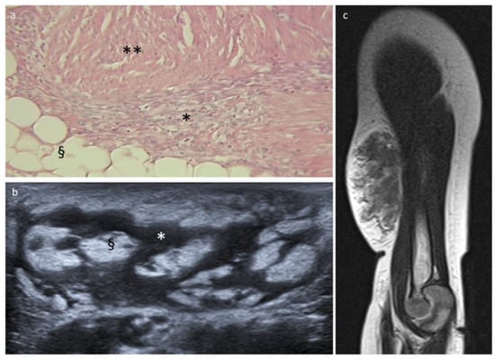 - Lee, S.; Choi, Y.H.; Cheon, J.E.; Kim, M.J.; Lee, M.J.; Koh, M.J. Ultrasonographic features of fibrous hamartoma of infancy. Skeletal Radiol. 2014, 43, 649–653. [Google Scholar] [CrossRef]