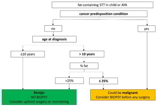 Cardoen L, Nicolas N, Le Gaudu V, Gauthier A, Carton M, Berrebi D, Cyrta J, Collignon C, Cordero C, Pierron G, et al. Fat-Containing Soft Tissue Tumors in Children, Adolescents, and Young Adults: Which Require Biopsy? Cancers. 2023; 15(12):3228. https://doi.org/10.3390/cancers15123228