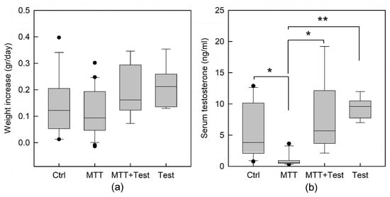 Serum testosterone levels in control mice, 5.8 + 1.4 ng/mL, were in line with normal levels found in mice [9,10]. Serum testosterone was significantly lower in MTT-treated animals compared to their control siblings (p < 0.05; Figure 1b), confirming the effect of the pharmacological treatment on steroid production. The testosterone replacement therapy restored the serum hormonal concentrations to levels comparable to those of untreated animals. The group of animals treated with the MTT-testosterone in combination did not differ from that treated with testosterone alone used as an internal control.