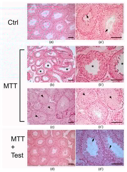 Photomicrographs of sections of testes from (a,a’, Ctrl) control, (b–c’, MTT) MTT-treated, and (d,d’, MTT + Test) MTT and testosterone-treated mice. Arrows: spermatozoa; asterisks: tubules with enlarged lumen; arrowheads: tubules with absence of lumen. Scale bar = 100 μm.